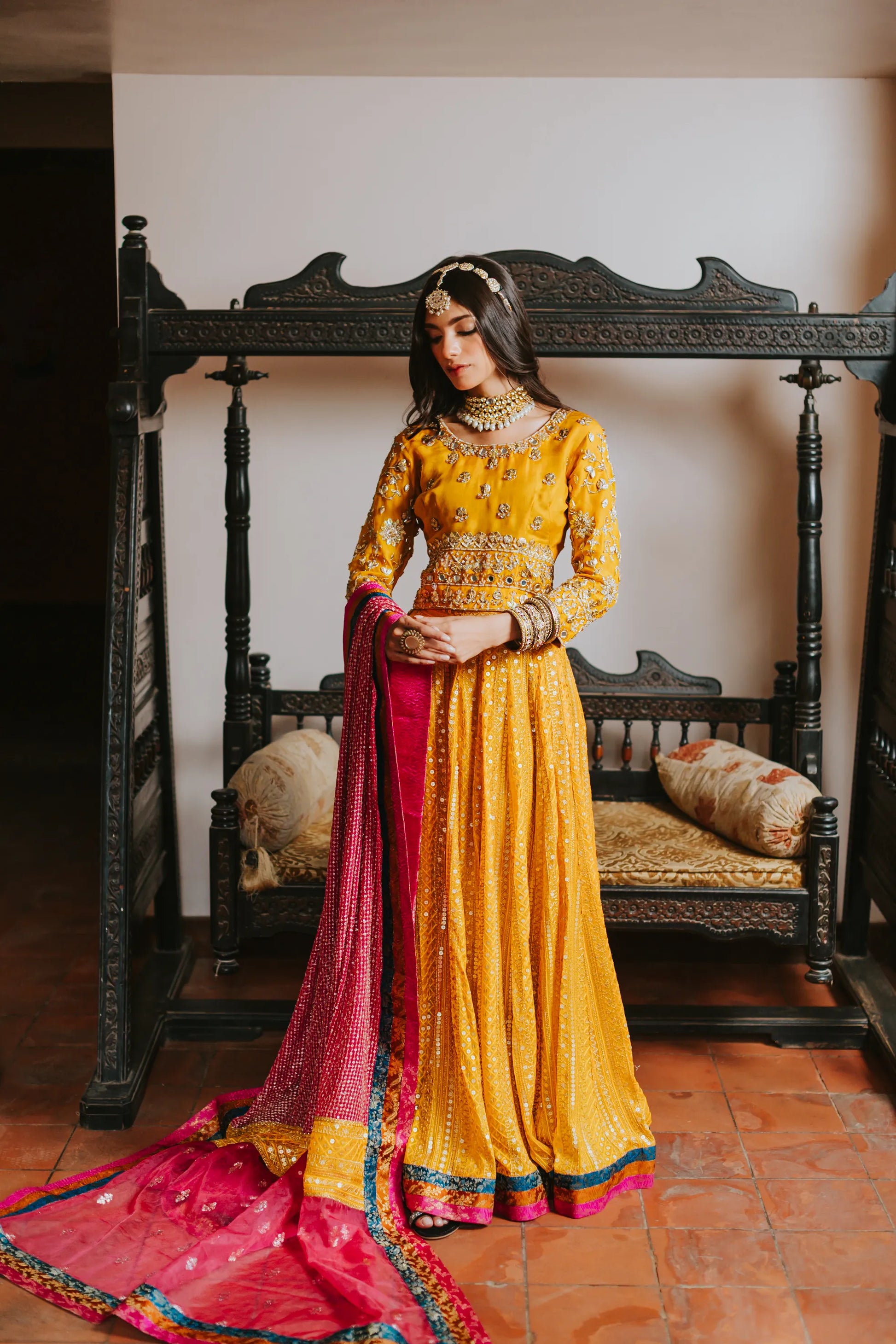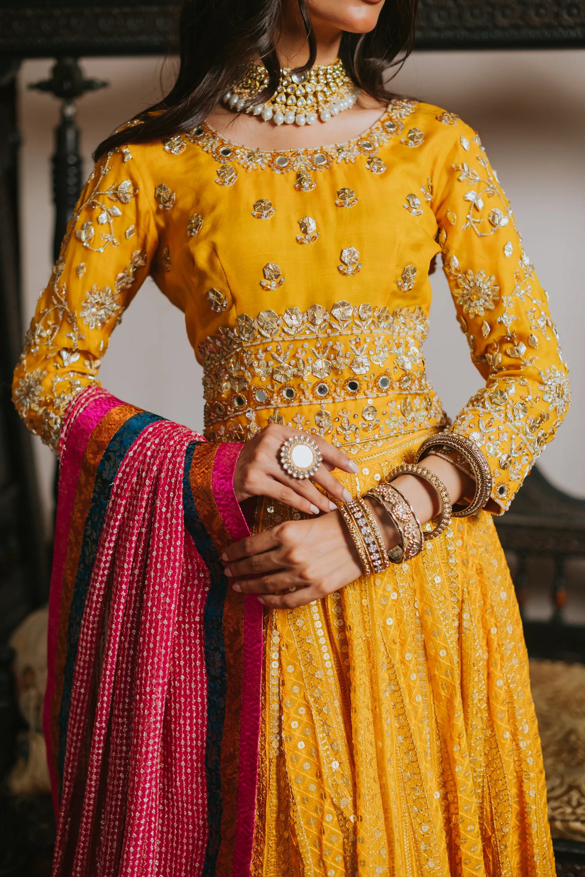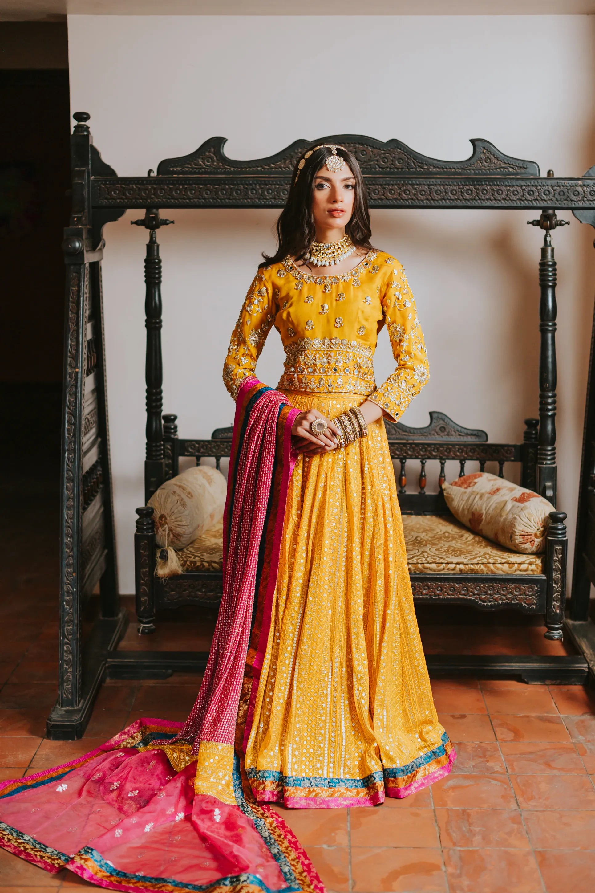 The most regal choli- lehenga in a beautiful festive traditional yellow embellished heavily with kora, dabka, cut-dana and hand made motifs. The intricate embroidery with traditional detailing of hanging tassels and it is complimentary by a chickenkari lehenga with banarsi block borders. Infused with most striking pure chickenkari dupatta with chickenkari borders and banarsi borders on all four sides. Introduces eye catching tapestries cascading through li the length im making the immediate center of attention.