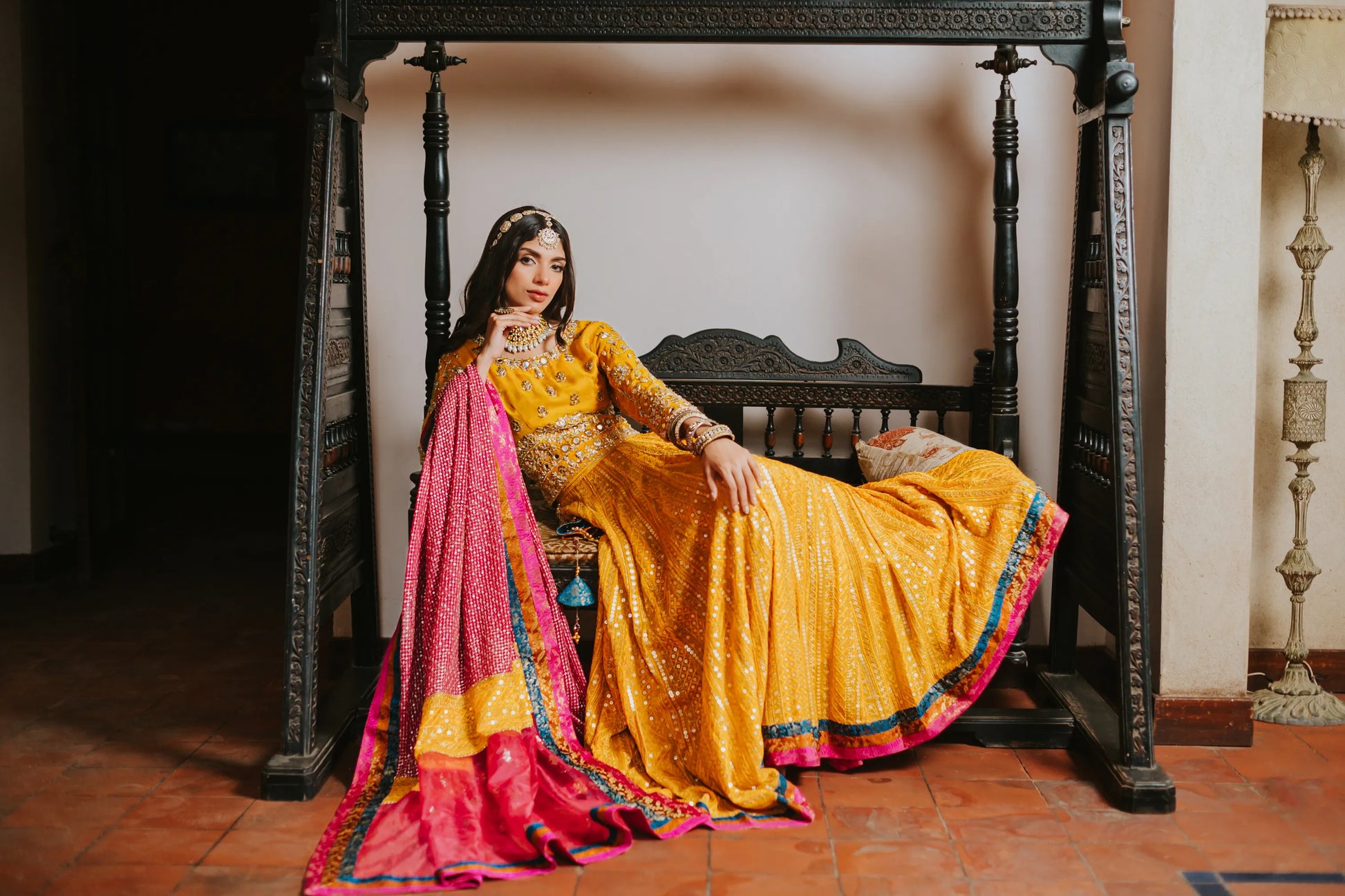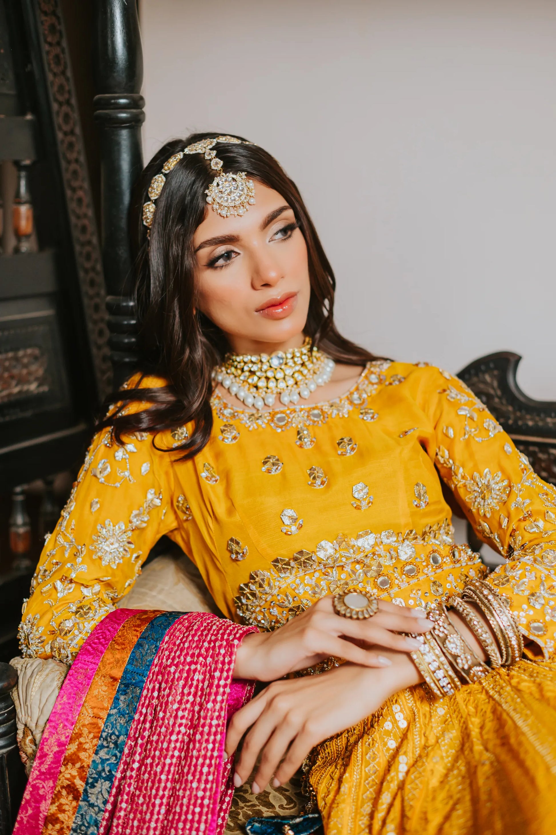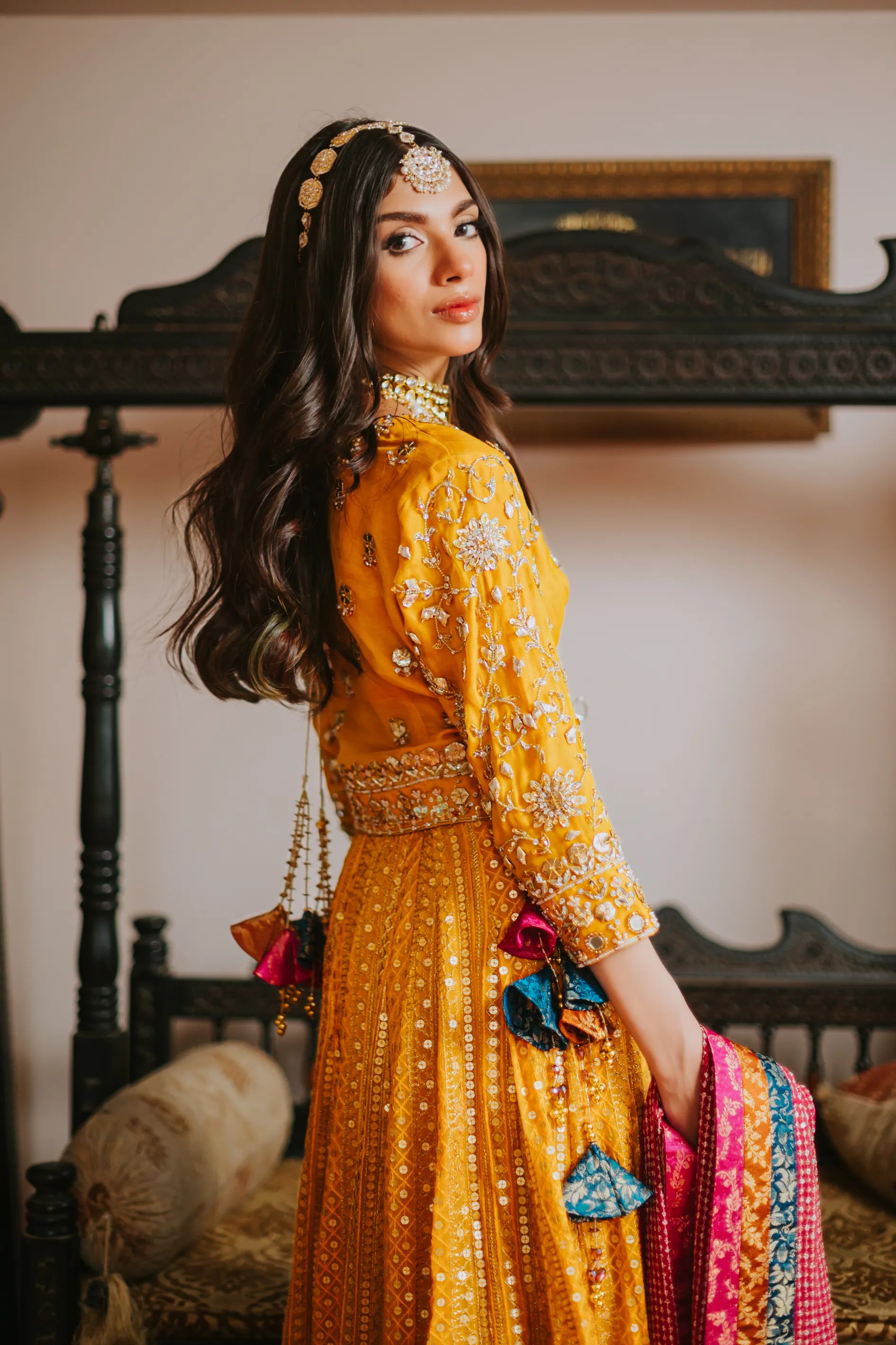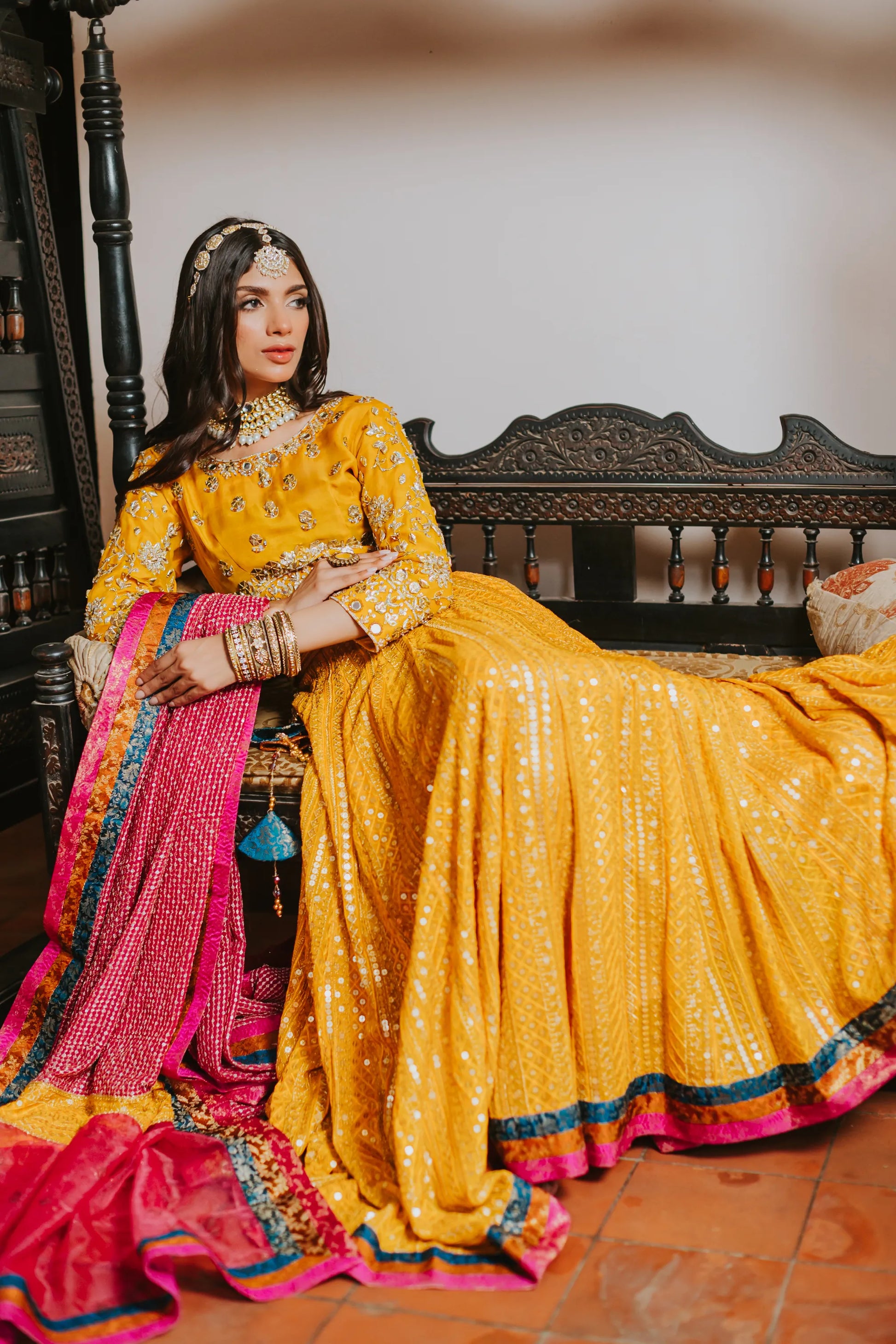The most regal choli- lehenga in a beautiful festive traditional yellow embellished heavily with kora, dabka, cut-dana and hand made motifs. The intricate embroidery with traditional detailing of hanging tassels and it is complimentary by a chickenkari lehenga with banarsi block borders. Infused with most striking pure chickenkari dupatta with chickenkari borders and banarsi borders on all four sides. Introduces eye catching tapestries cascading through li the length im making the immediate center of attention.