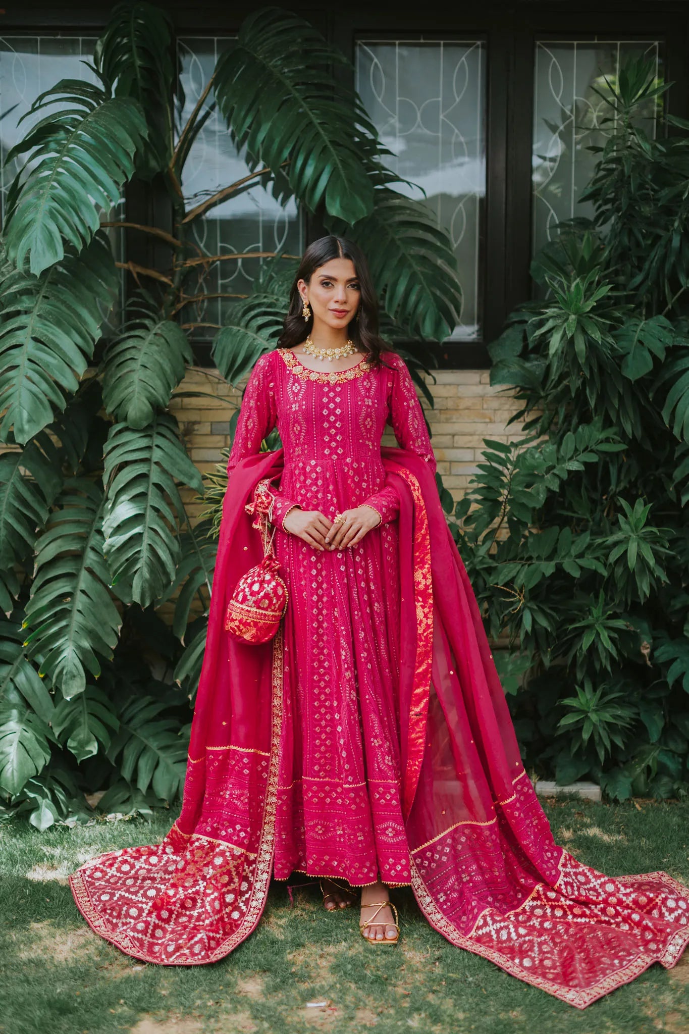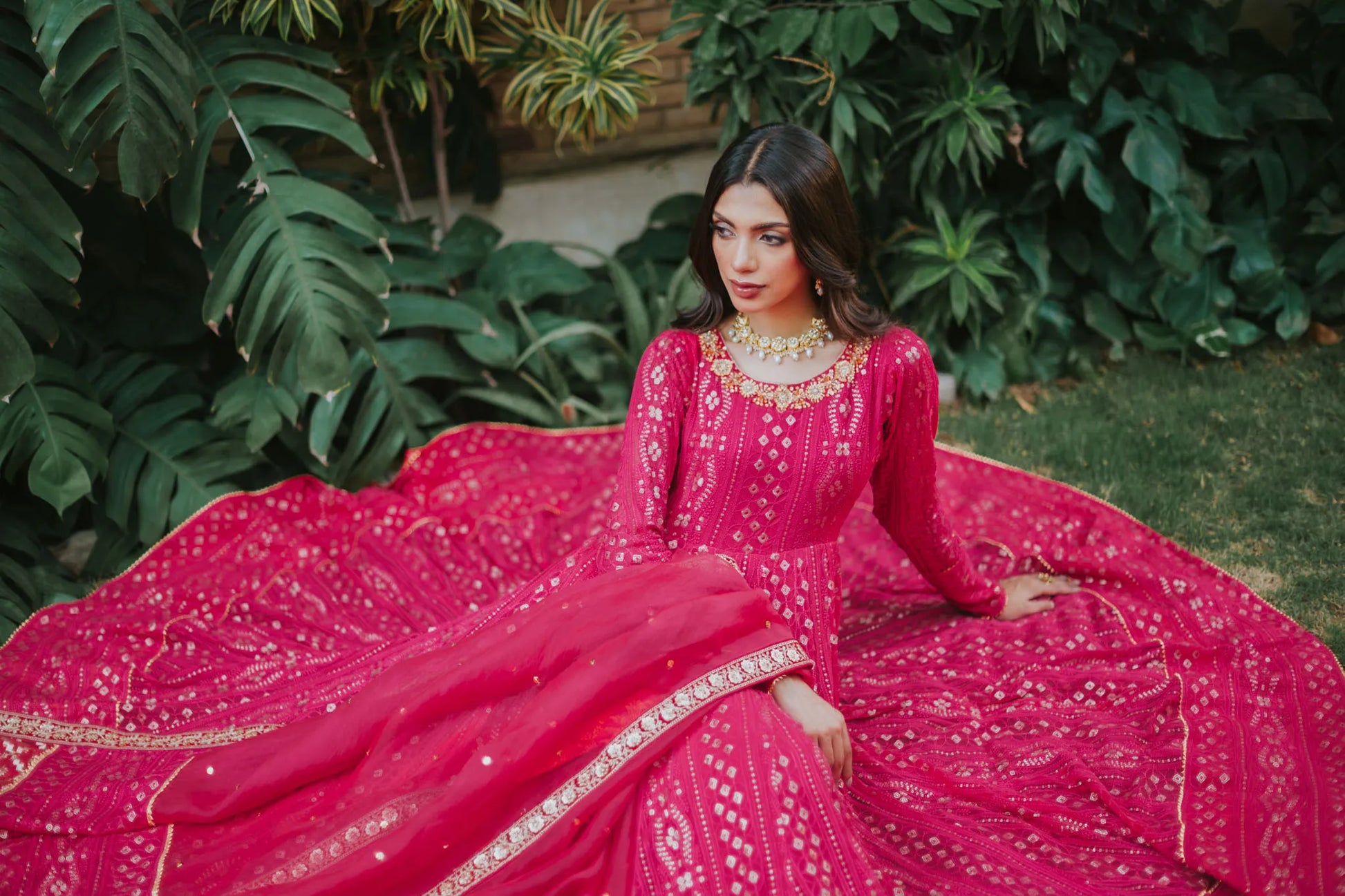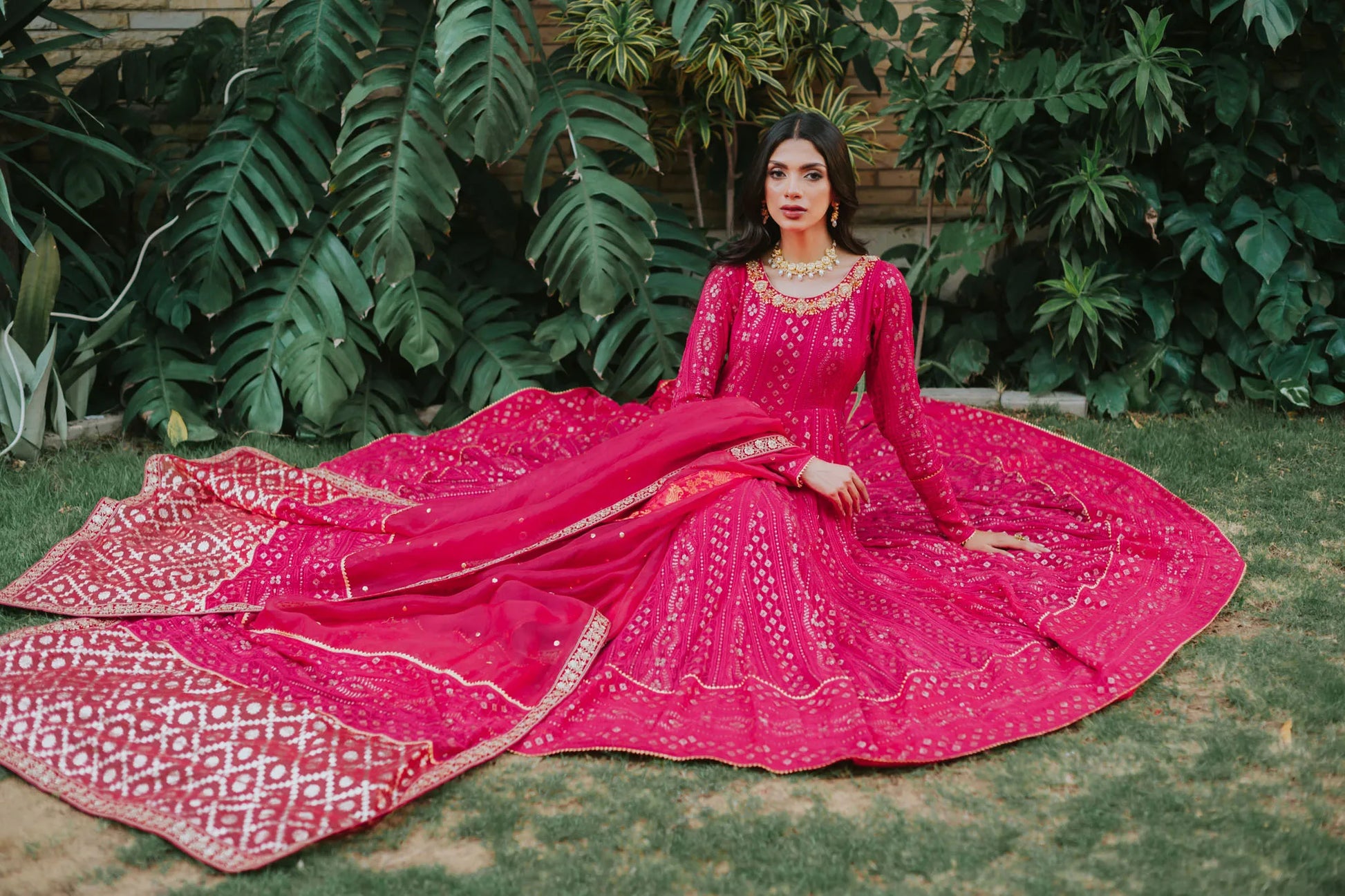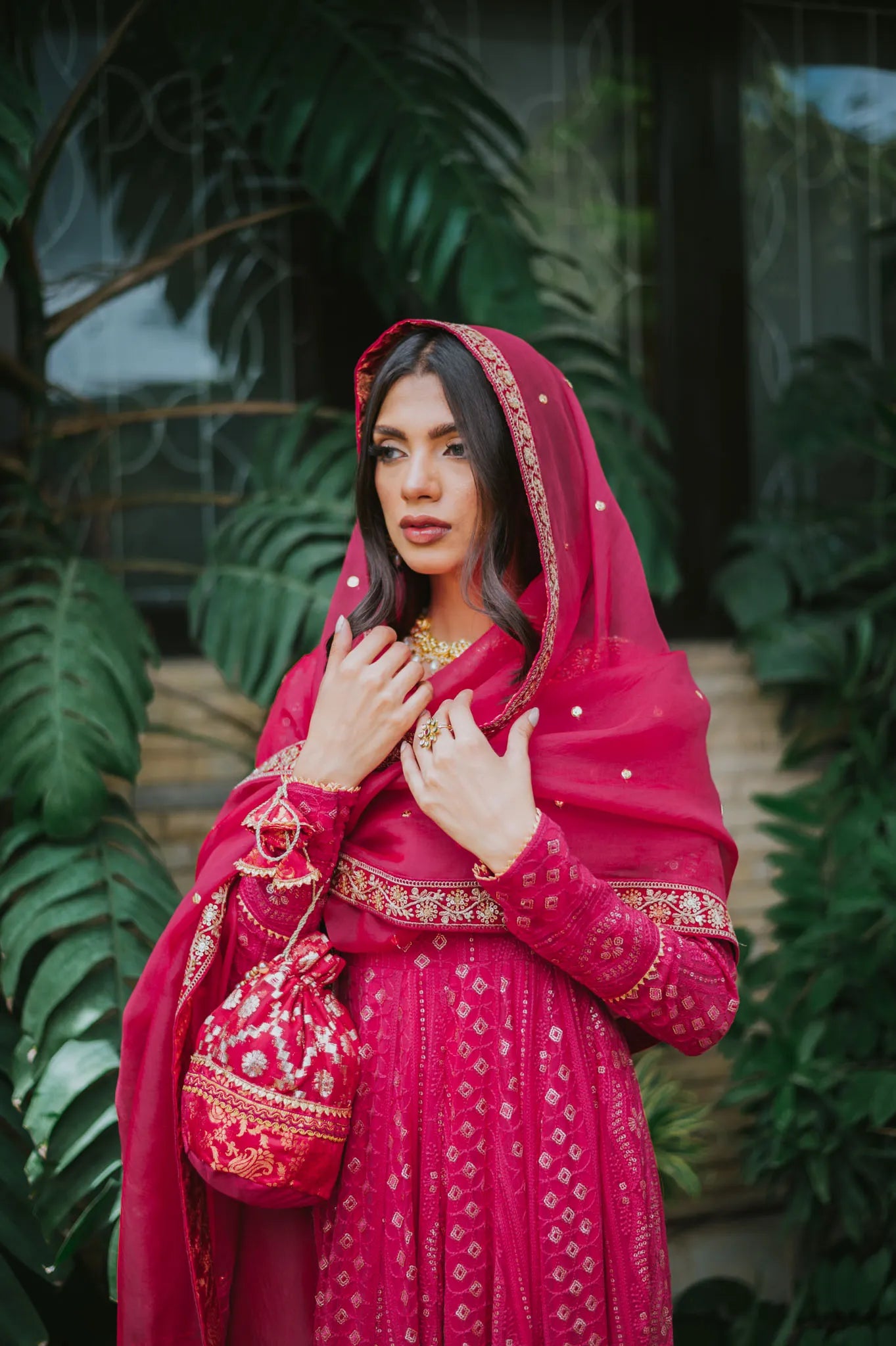 A classic jewel- tone statement outfit is all the obsession in this season. A striking ruby toned ensemble with a traditional neckline enhanced by intricate hand embellishment. The forever flattering kalidar silhouette makes this an easy go-to outfit for every occasion.