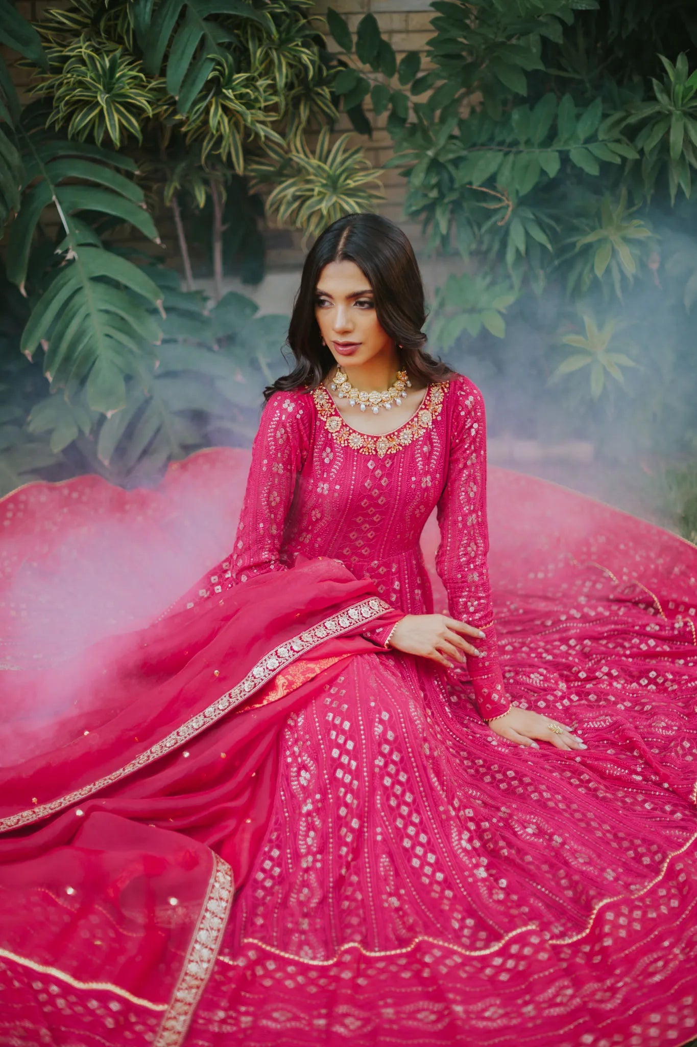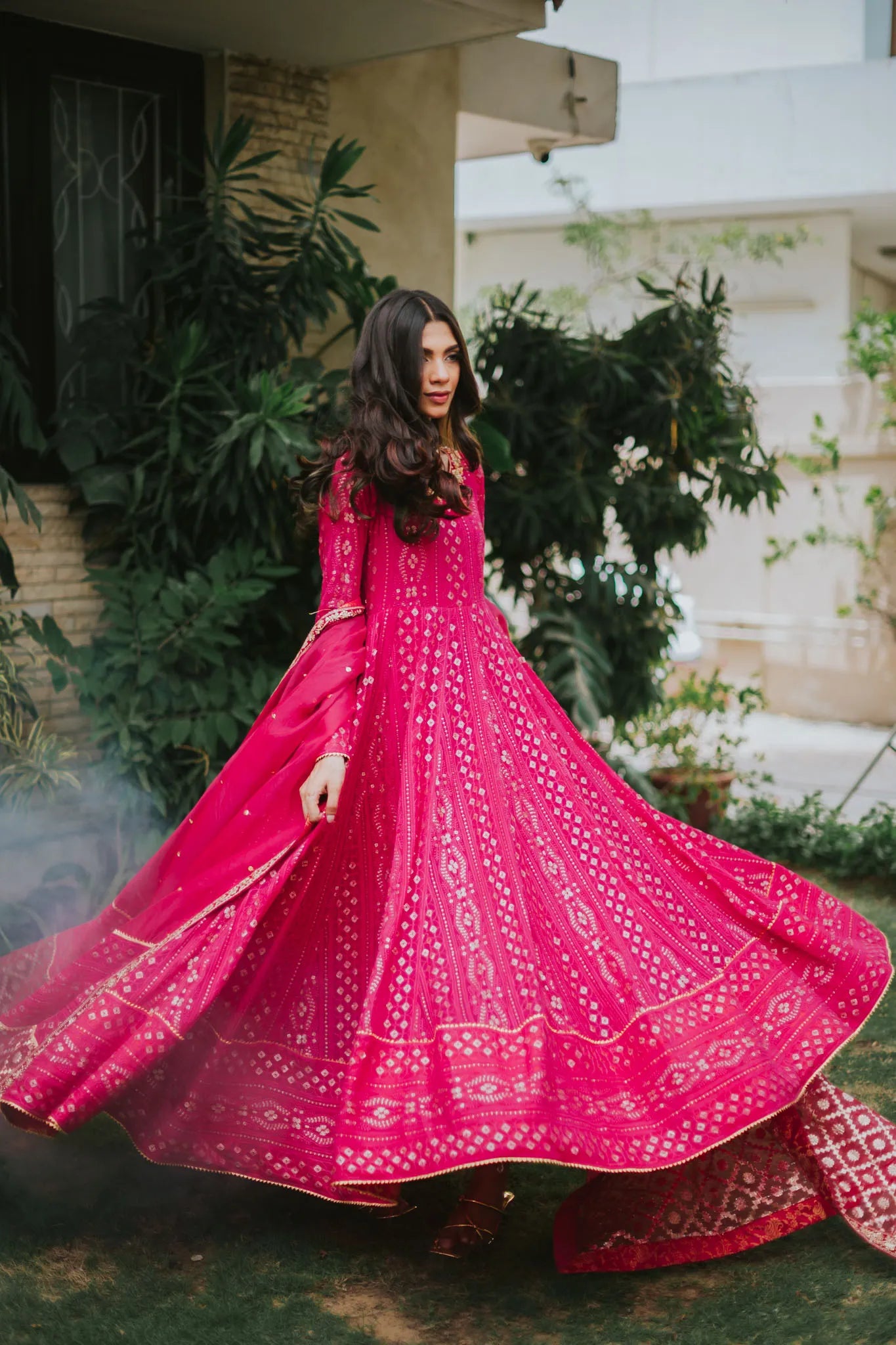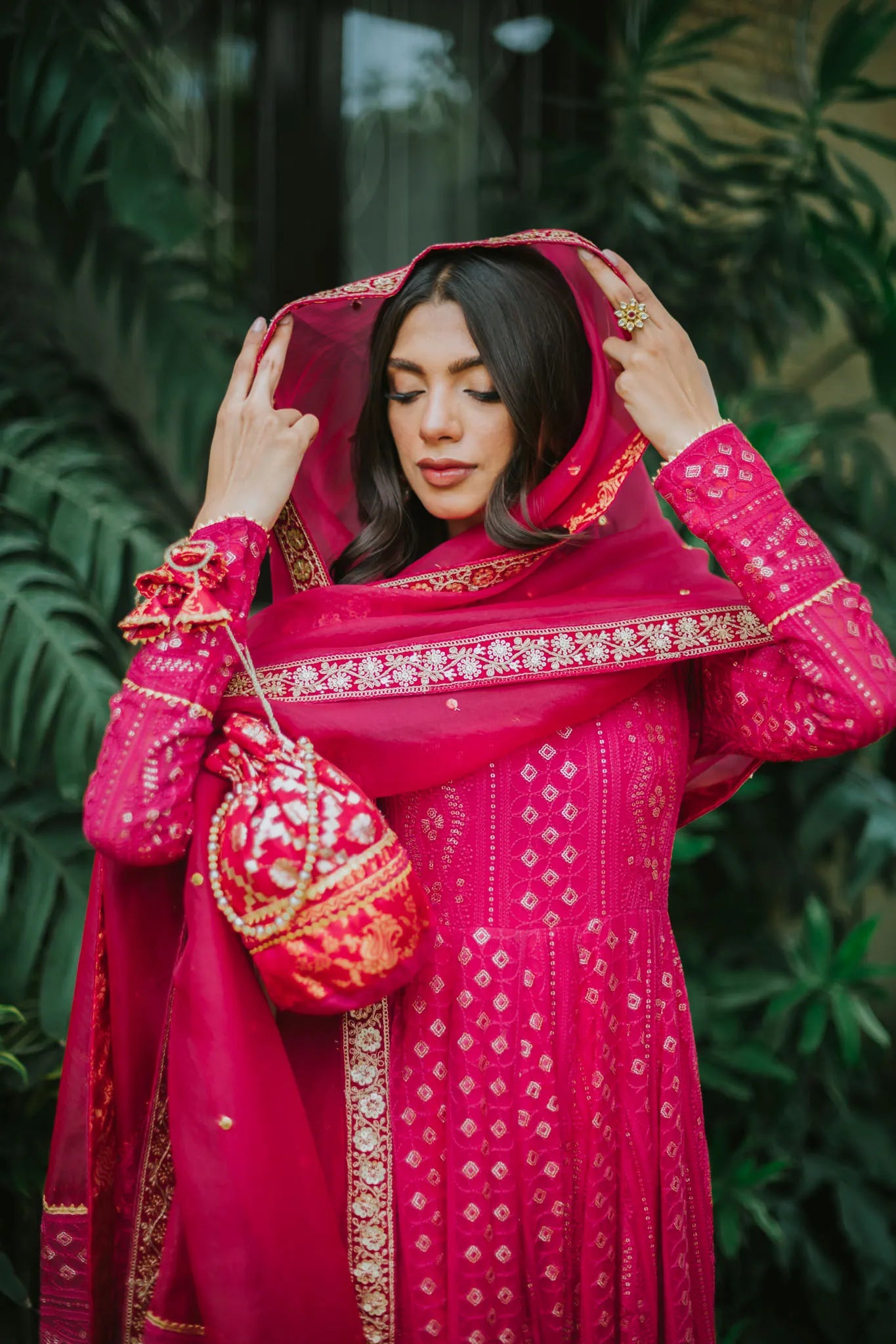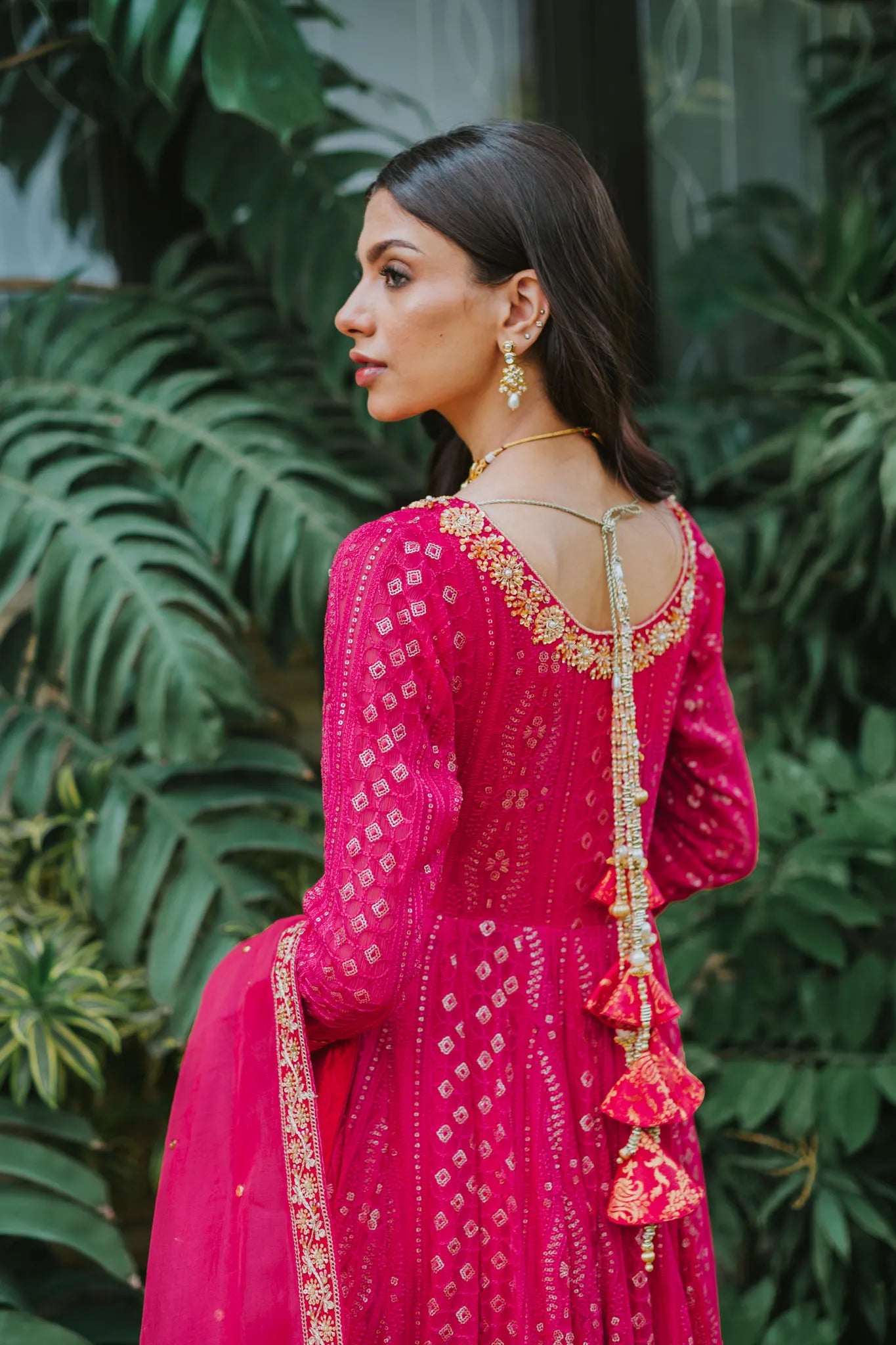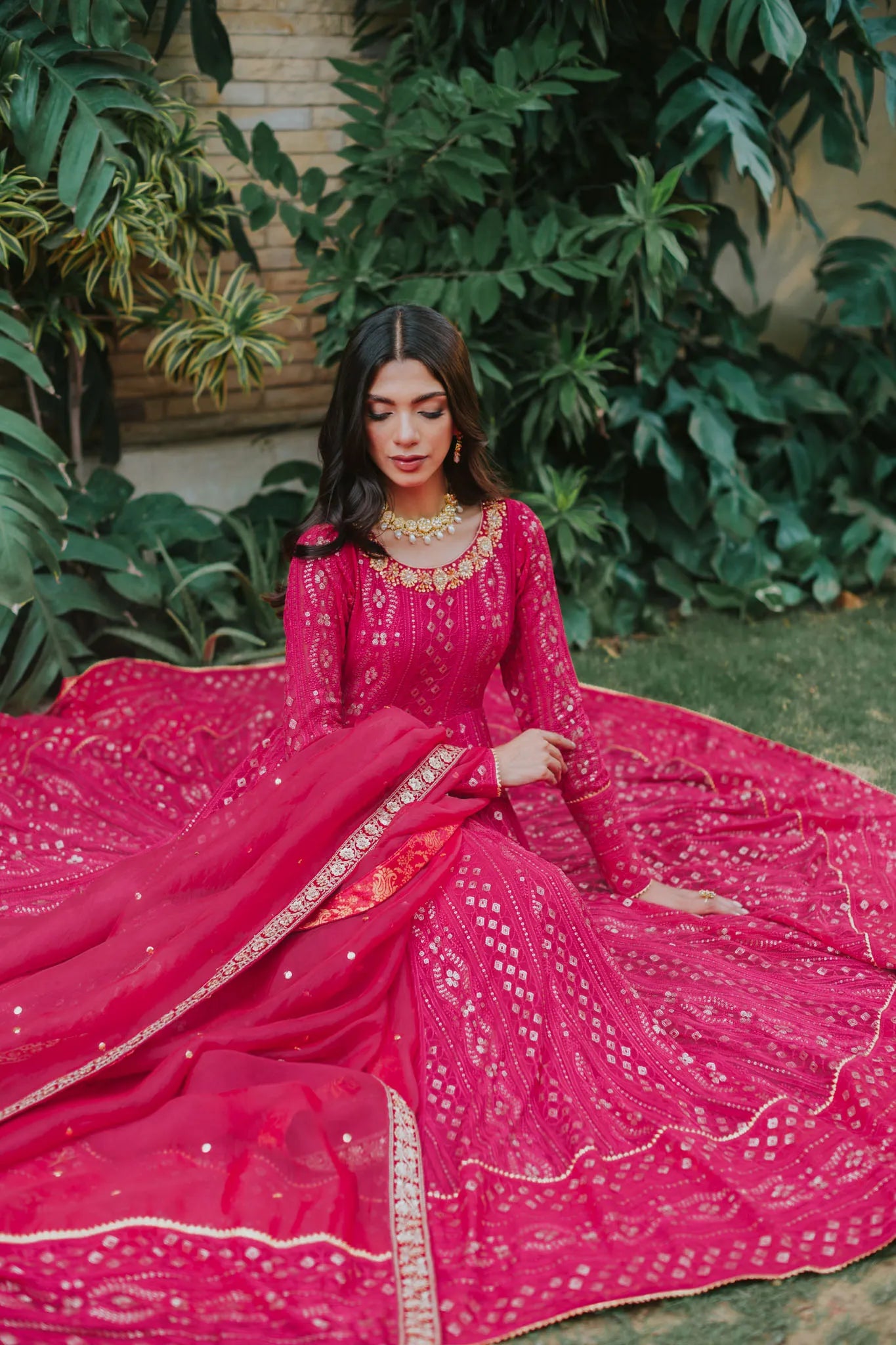 A classic jewel- tone statement outfit is all the obsession in this season. A striking ruby toned ensemble with a traditional neckline enhanced by intricate hand embellishment. The forever flattering kalidar silhouette makes this an easy go-to outfit for every occasion.
