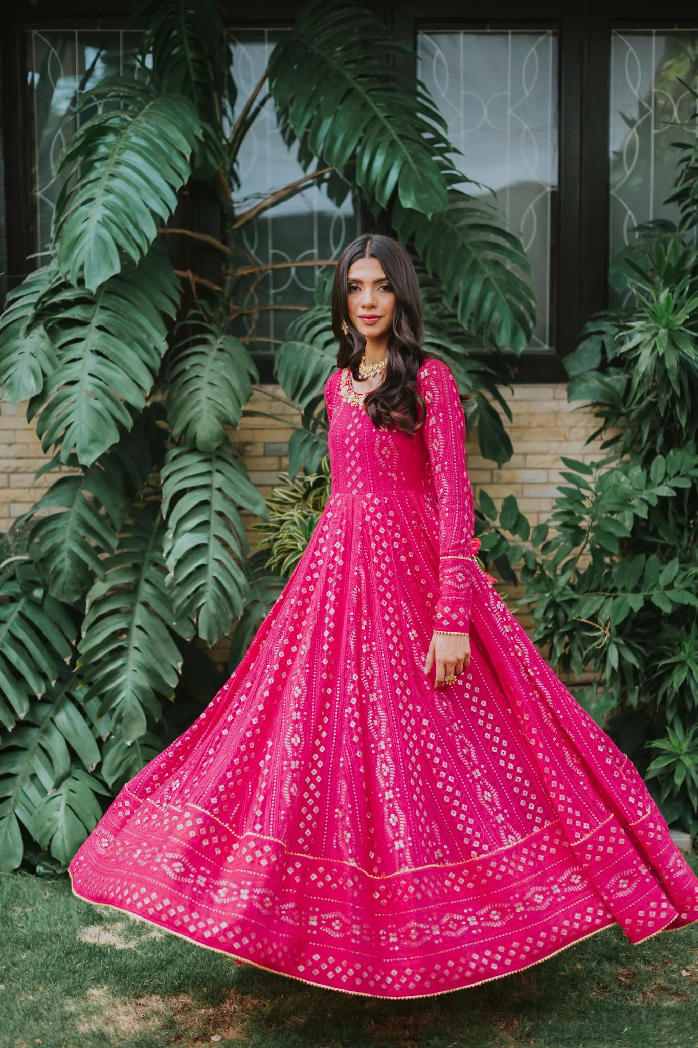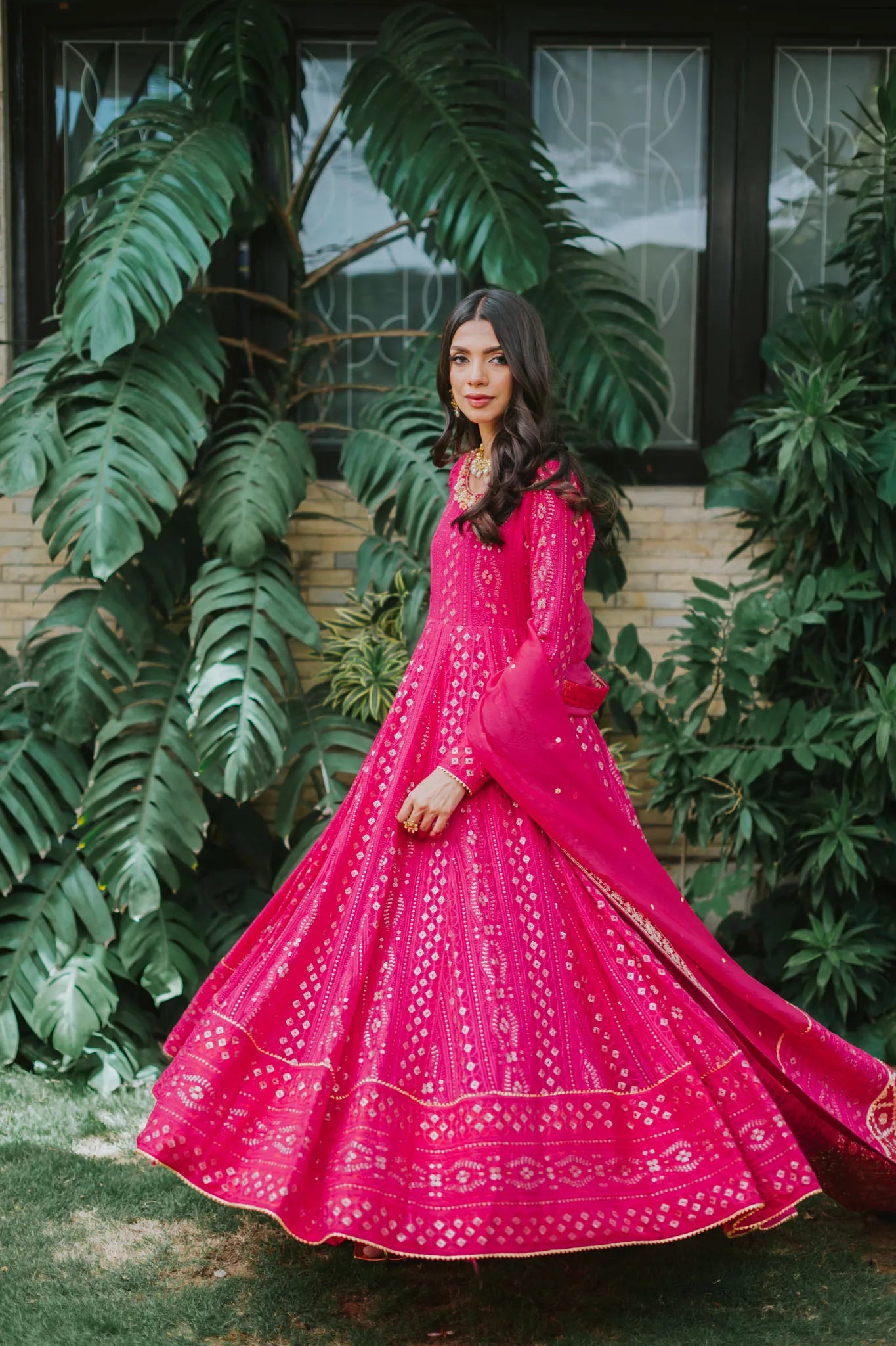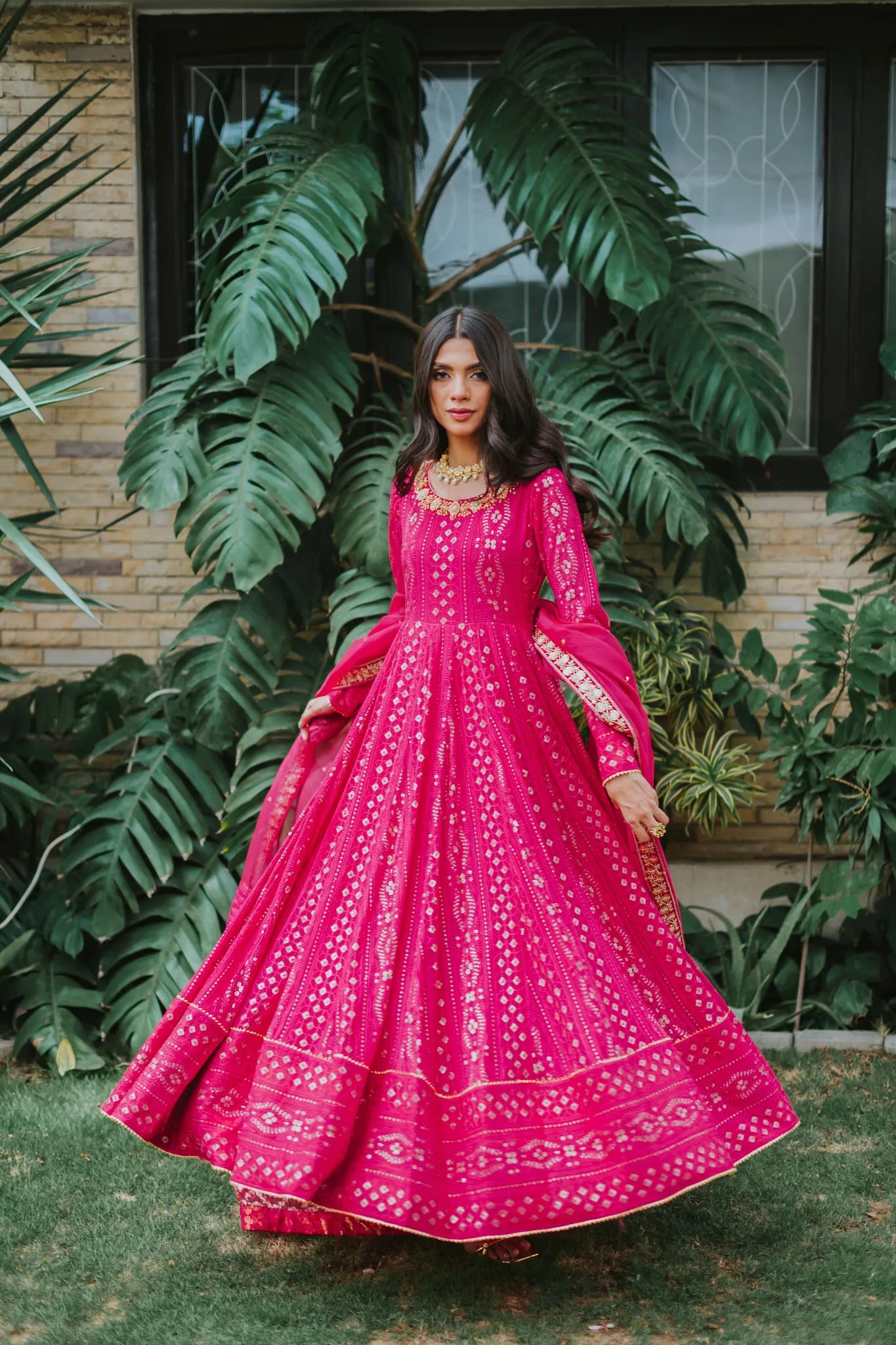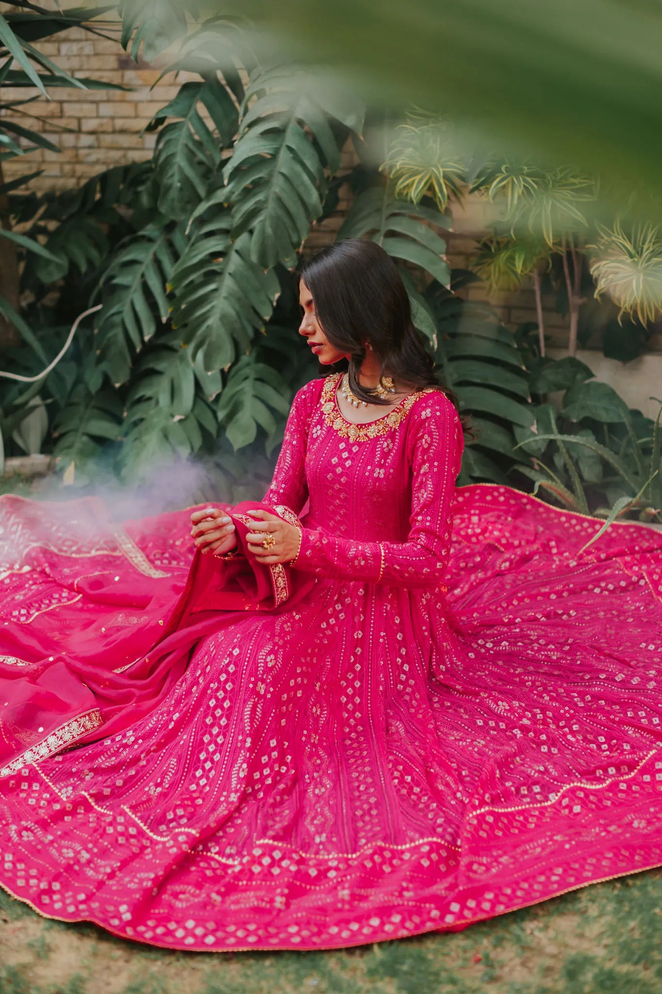 A classic jewel- tone statement outfit is all the obsession in this season. A striking ruby toned ensemble with a traditional neckline enhanced by intricate hand embellishment. The forever flattering kalidar silhouette makes this an easy go-to outfit for every occasion.