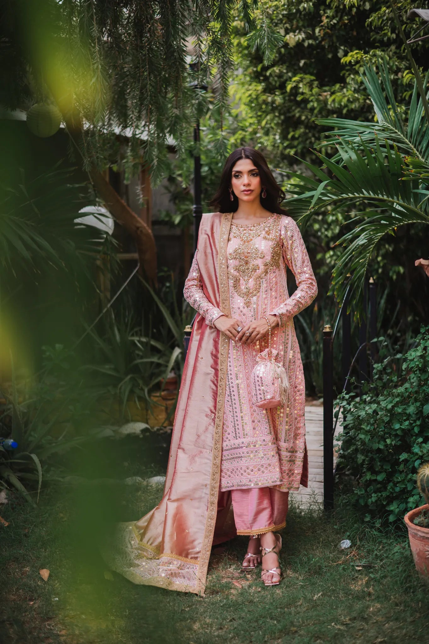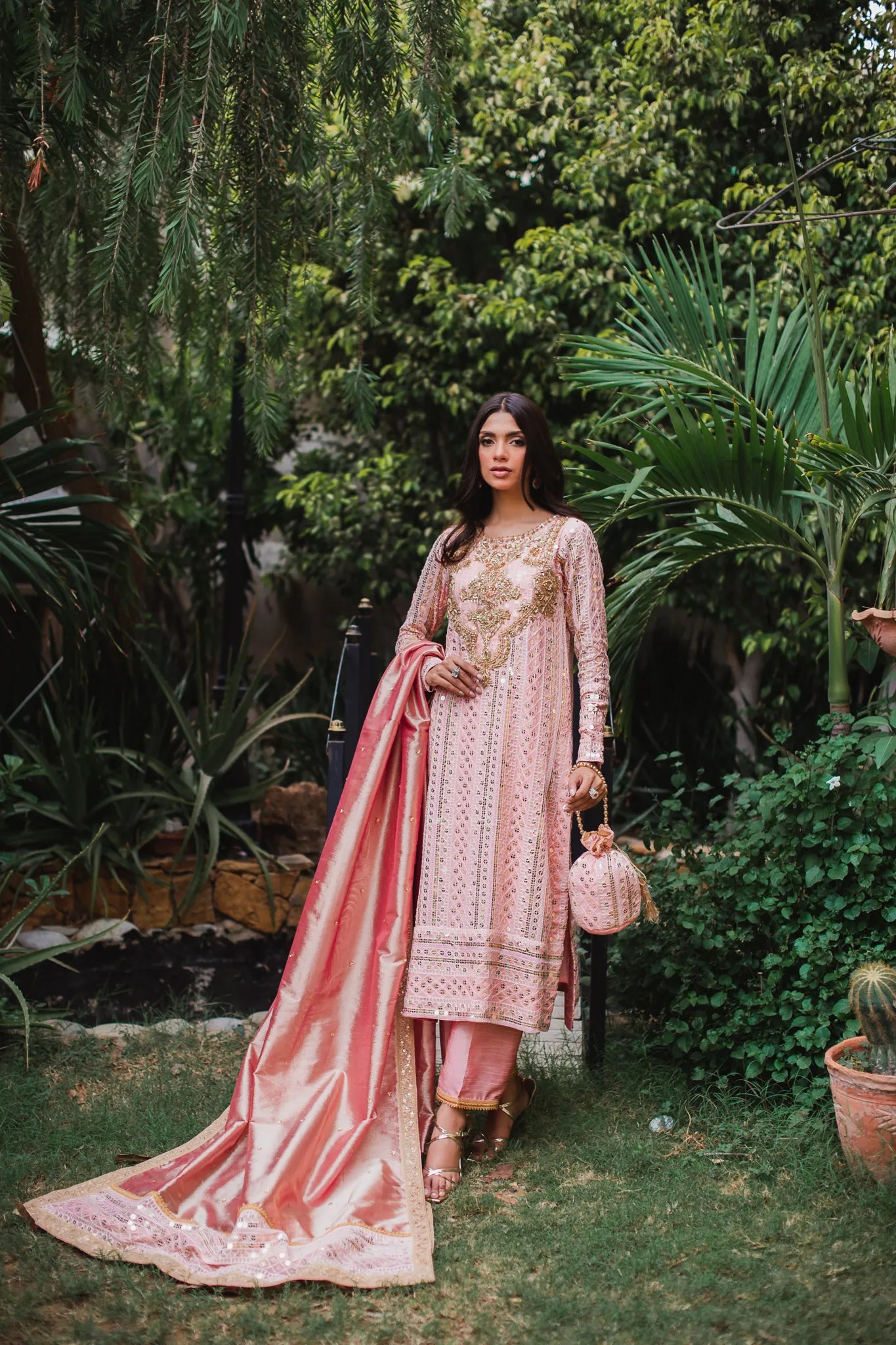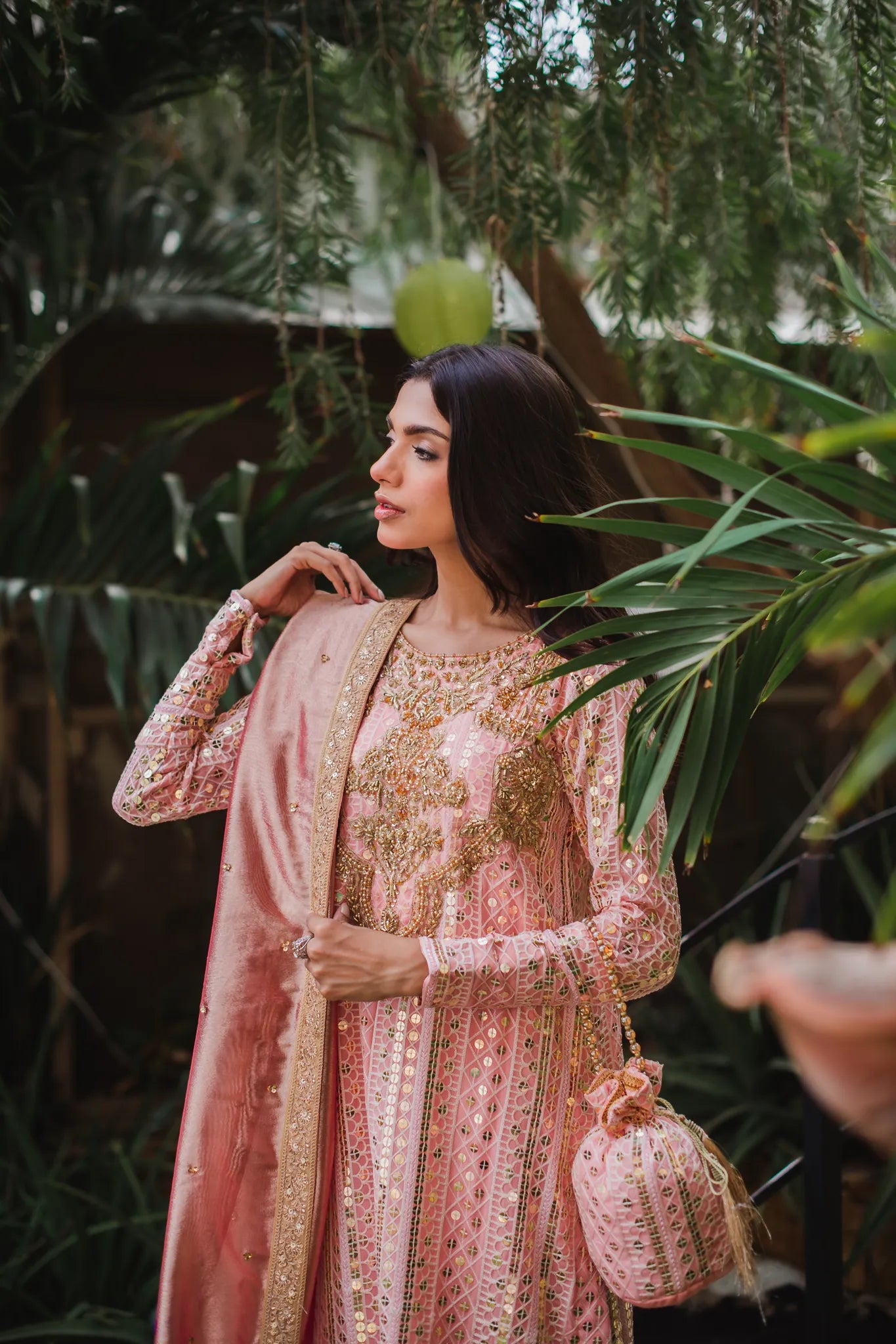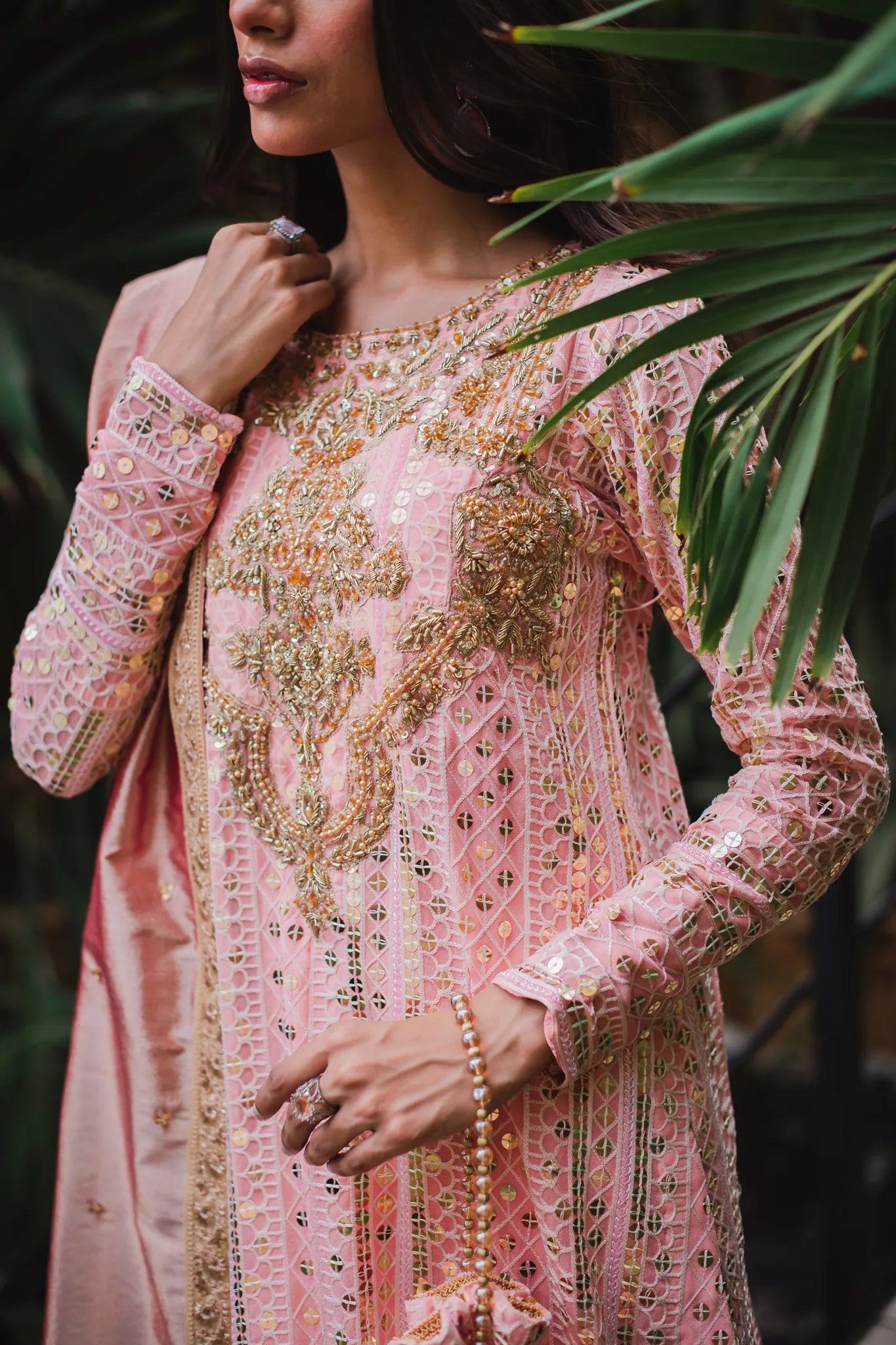A gorgeous pure chiffon shirt, in the freshest shade of peach. Adorned with a pristine peach and gold chickenkari embroidery blooming beautifully all over the shirt, further enhanced with delicate embellished neckline with kora, dabka, sequence, cut-dana. Pure lamme tissue dupatta with gorgeous chickenkari and Indian lace embellishment pallus. Smartly style this ensemble.