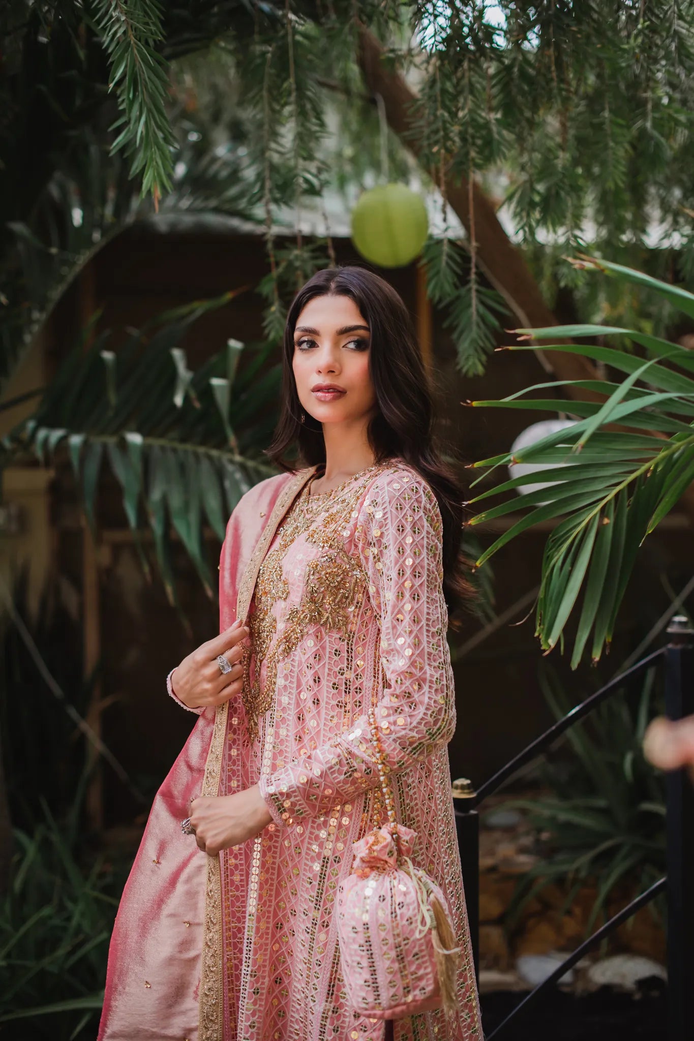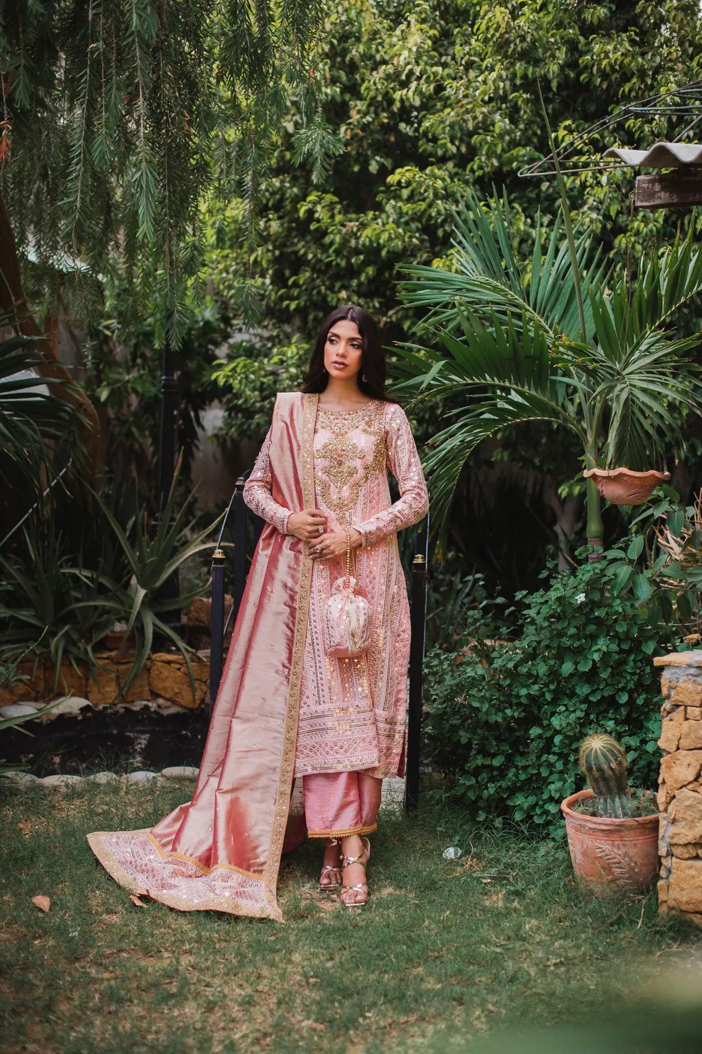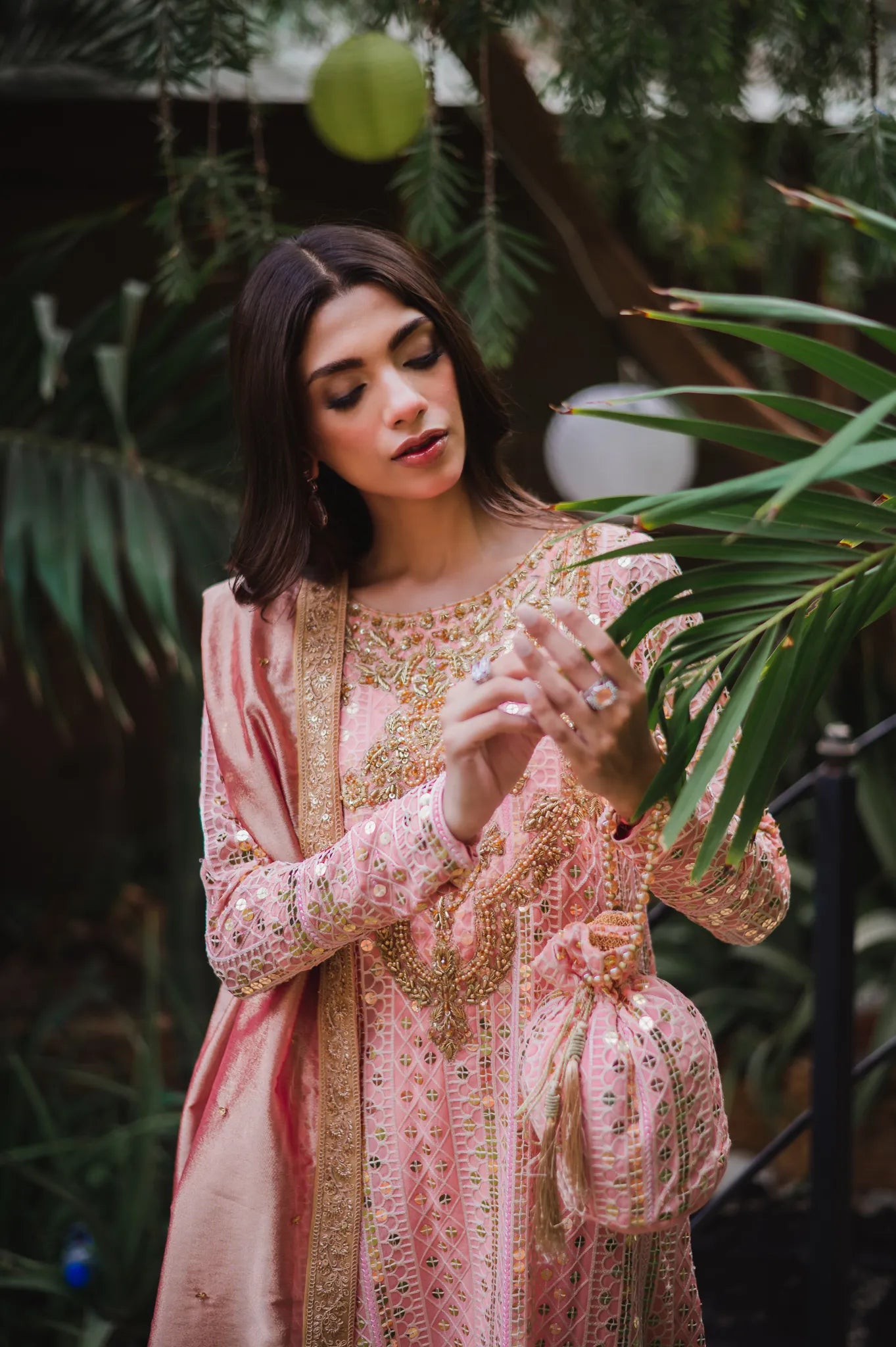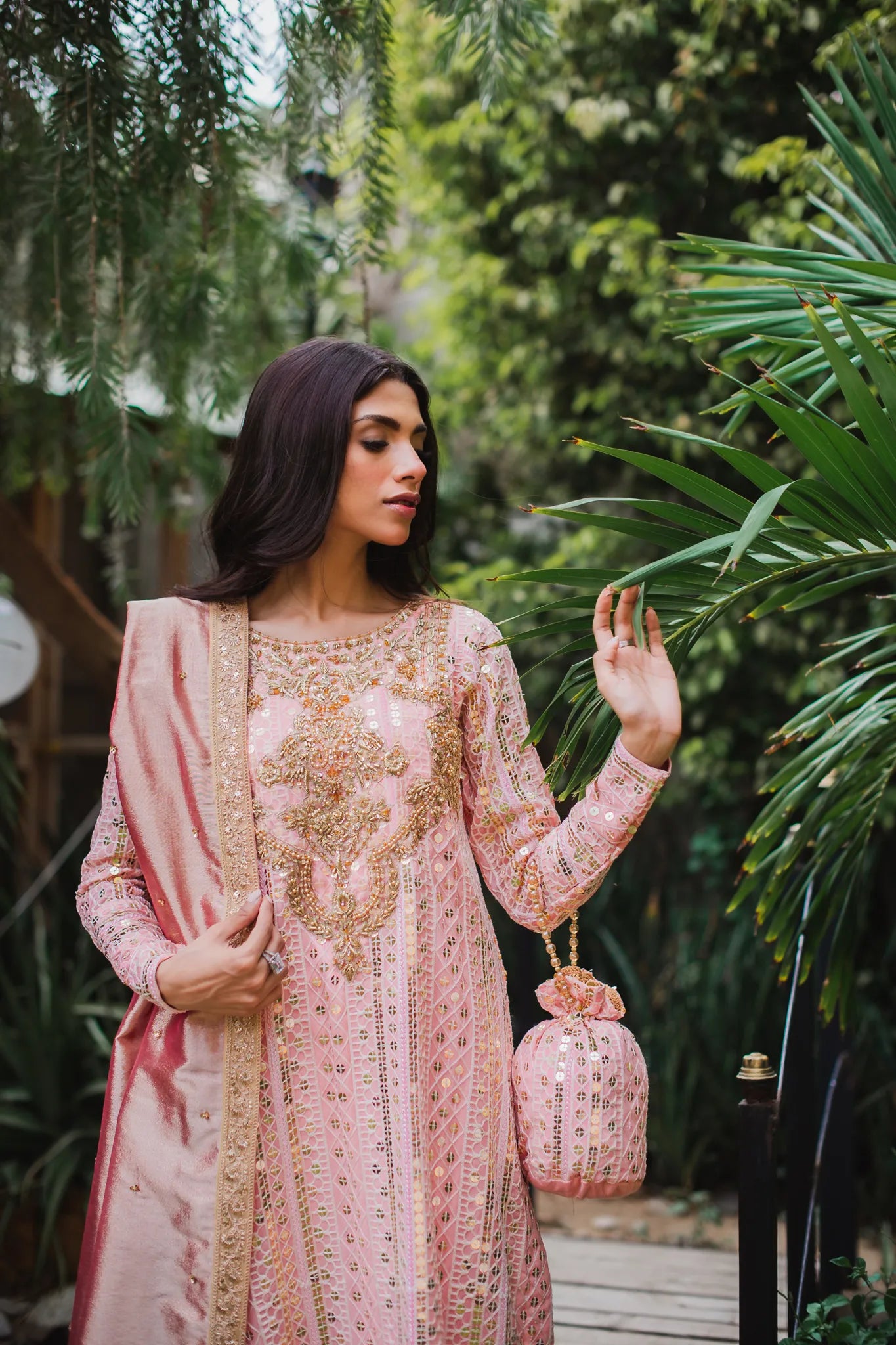 A gorgeous pure chiffon shirt, in the freshest shade of peach. Adorned with a pristine peach and gold chickenkari embroidery blooming beautifully all over the shirt, further enhanced with delicate embellished neckline with kora, dabka, sequence, cut-dana. Pure lamme tissue dupatta with gorgeous chickenkari and Indian lace embellishment pallus. Smartly style this ensemble.